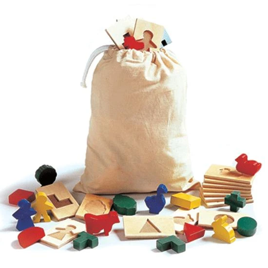 Our Feel and Find Bag comes with 20 matching wooden shapes and textured tiles in a durable, cloth sack. Simply deal out the tiles. Then, have players reach into the bag to “feel and find” the corresponding shape. Create 2 different games by using the 10 geometric and 10 object shapes separately, or use all 20 as a whole-object puzzle.