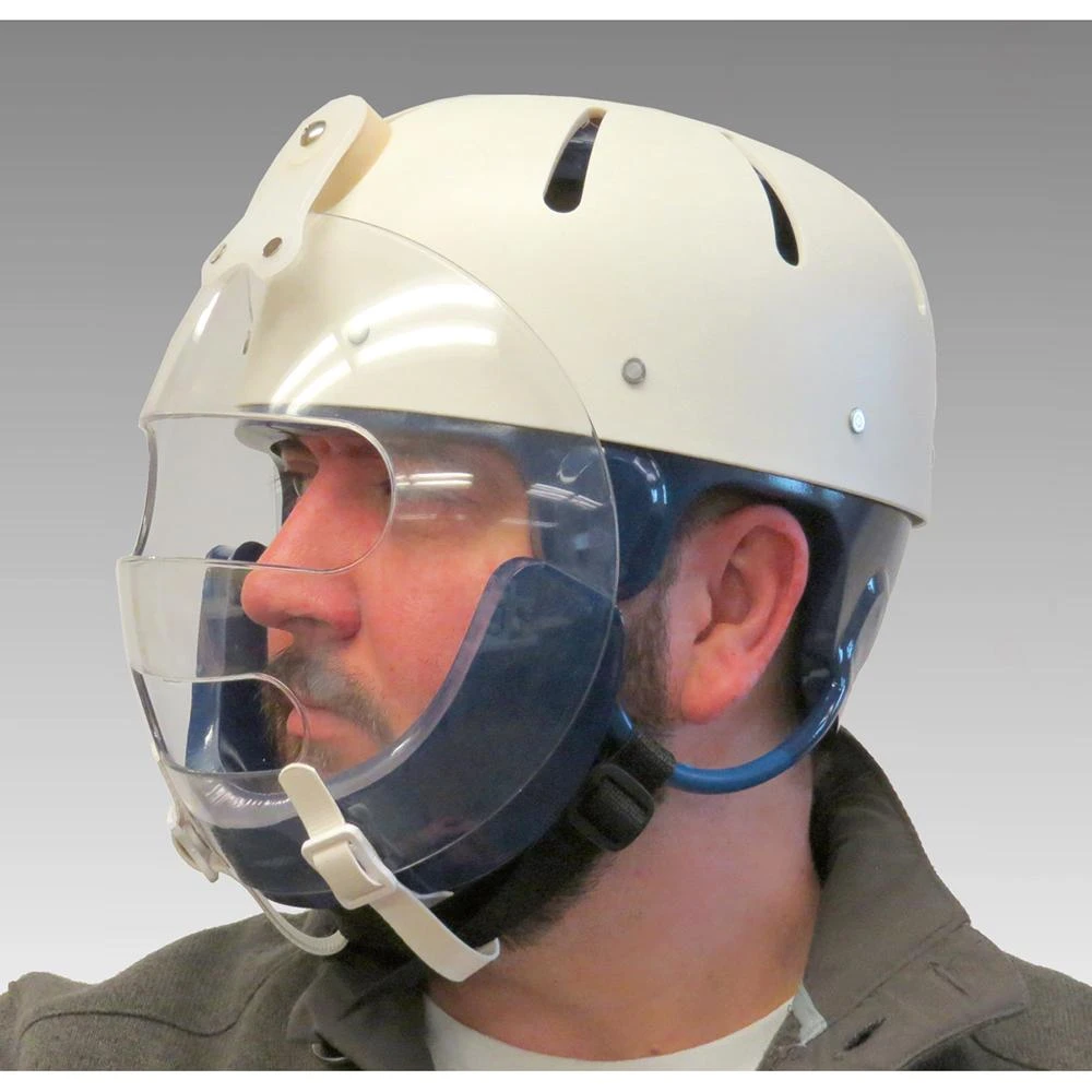 Allows unrestricted body movement while protecting the head and face. Hard outer shell, 1/2″ shock-absorbent foam liner, with woven chin strap and buckle fastener. Washable.