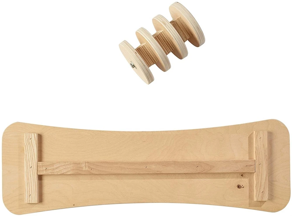Great exercise! High-quality, polyurethane-finished hardwood balance board includes a wooden roller that slides underneath the board’s 19″ long track, creating a challenging and fun balance activity. Features anti-skid strips for safer control. SIZE: 31 1/2″L x 10″W x 3/4″ thick. Roller measures 6 1/4″L (requires minimal assembly). Max weight limit: 300 lbs. For ages 5-adult.